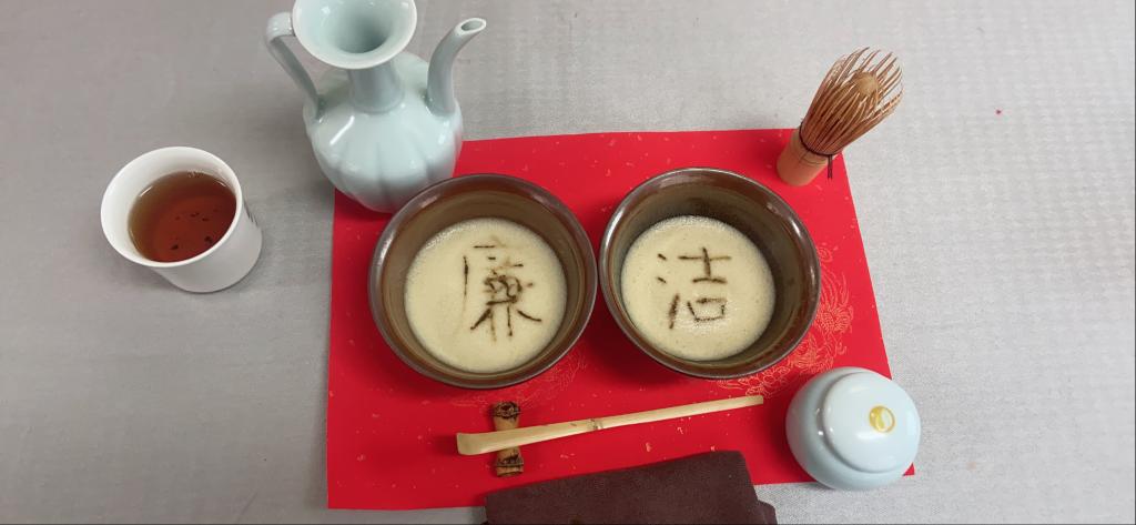 活动伊始,茶艺老师通过讲解宋朝茶文化、宋代点茶、新时代茶廉文化为大家介绍“廉美和敬”四大点茶特色。在优雅的古琴声中,老师向学员们演示了宋式“七汤点茶”制作流程。随后,在茶艺老师的指导下,大家静心体验点茶带来的雅趣,并给各自的作品上点出“廉”“洁”等字样,一同感受茶艺高洁的意境,领悟“茶廉文化”的深刻内涵。