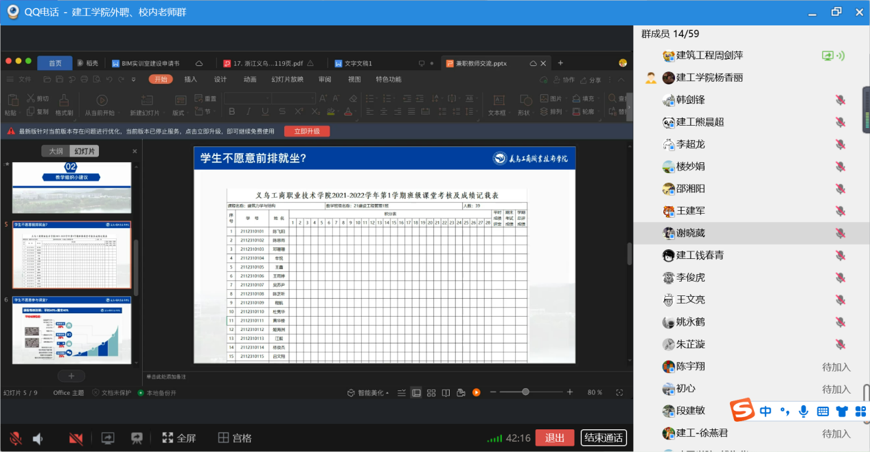 会上,教科办老师从校内外一对一帮扶制度、本学期校历调整解读、教务系统、教学常规系统、调停课、车辆进校申请等各方面常规使用做了梳理与演示。督导组负责人详细讲解教学常规材料检查所需材料与标准,以教学常规检查材料做引,针对教师授课效果、师生互动、学生座位等给予建议提高学生学习效果。最后,学院教学负责人结合本学期的教学工作,强调三点:一是进一步增强主人翁意识,以更强烈的责任心、事业心、进取心对教学工作中存在的问题与不足加以改正,把最好的一面展现在课堂上;二是进一步提高自己的业务水平,利用“一对一”帮扶制度,在提高自身实际教学能力的同时也提升校内老师的实践能力;三是进一步加强学校与企业之间的联系,以外聘教师为纽带,增加校企合作,提高人才培养质量的同时,也为义乌市建设行业做些贡献。