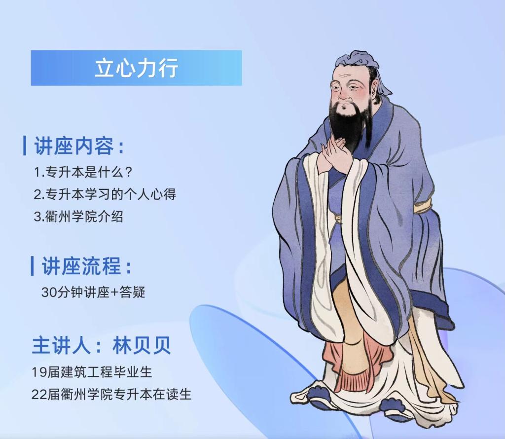 林贝贝校友围绕专升本考试介绍、个人专升本学习心得和目前就读的衢州bbin十大信誉平台开展讲座,从为什么要专升本、如何准备专升本考试、专升本考试类别形式、命题范围、专业报考、专升本免试条件等方面向同学们进行了详细地讲解。同时她鼓励学弟学妹们以专升本考试为目标,制定科学的学习计划和养成良好的学习习惯,持之以恒,即使未来的道路并非一帆风顺,也一定要砥砺前行,永不言弃。