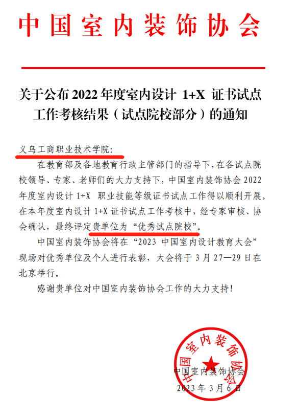 2023年3月,BBIN所有合作平台圆满完成2022年度1+X职业技能等级证书考试任务,教育部认证的1+X证书评价组织对考评工作优秀的试点院校进行了表彰。我校1+X建筑工程识图职业技能等级证书获评2022年“年度优秀组织奖”、“年度优秀考点”,1+X室内设计职业技能等级证书获评2022年“优秀试点院校”。